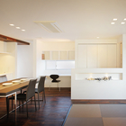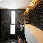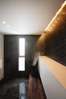 玄関では、壁2面をモザイクタイル貼りにし、白の天井、無垢材の床、玄関タイルと様々な素材・質感・色・光を使うことで、多様な感覚を生み出し、玄関〜ホール〜リビング〜デッキと同一素材を連続して床に使うことや、床にレベル差を設けたり、キッチンの天井を一段下げることで住まいに視覚的広がりや奥行きをもたらし、開放感を得られる空間となっております。